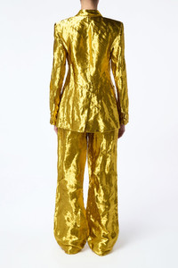 The soft woven Mick blazer is formed from woven metal fabricated from a unique blend of 96% copper and 4% silk to create a fabric that resembles pure gold cloth. A deep V neckline and slim fit through the sweep completes this perfect statement piece. Details: - 96% Metallic Fiber 4% Silk - Single-breasted - Dual pockets - Dual Lapels