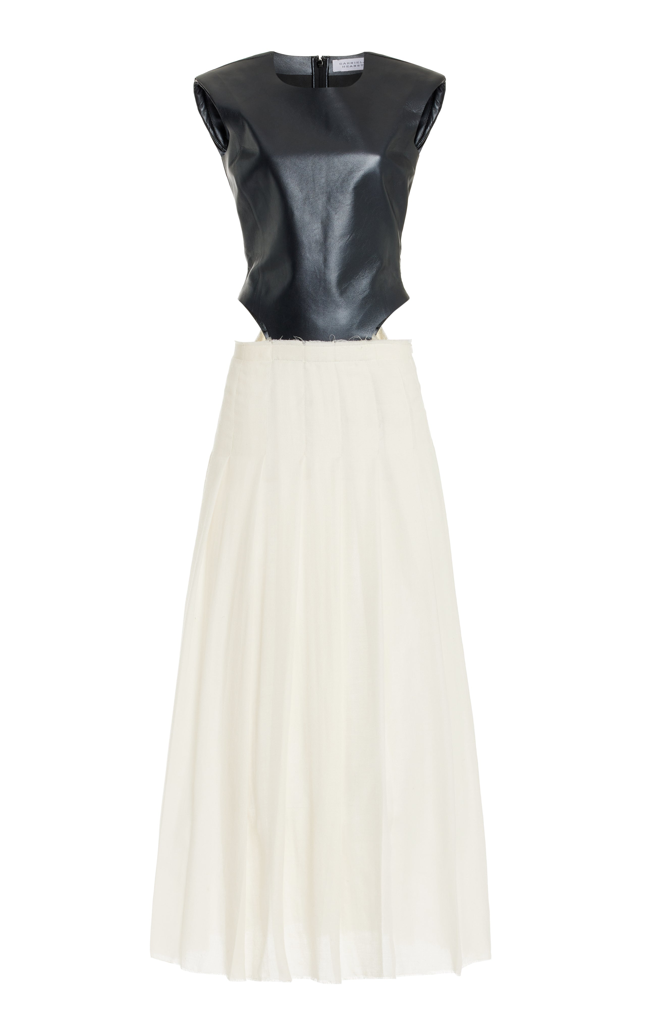 A striking stand-out piece is created in the Mina dress; complete with a fitted leather bodice that contrasts against a softer pleated skirt in wool cashmere voile. A cut-out detail on the hips adds a subtle element of surprise. Details: - 100% Lamb Leather Bodice 65% Virgin Wool 35% Cashmere - Back-zip closure - Cut-out detail - Pleated - Made in Italy Size and fit: Slim Fit. Fits true to size. Model is 5'11" and wearing a size IT 38.