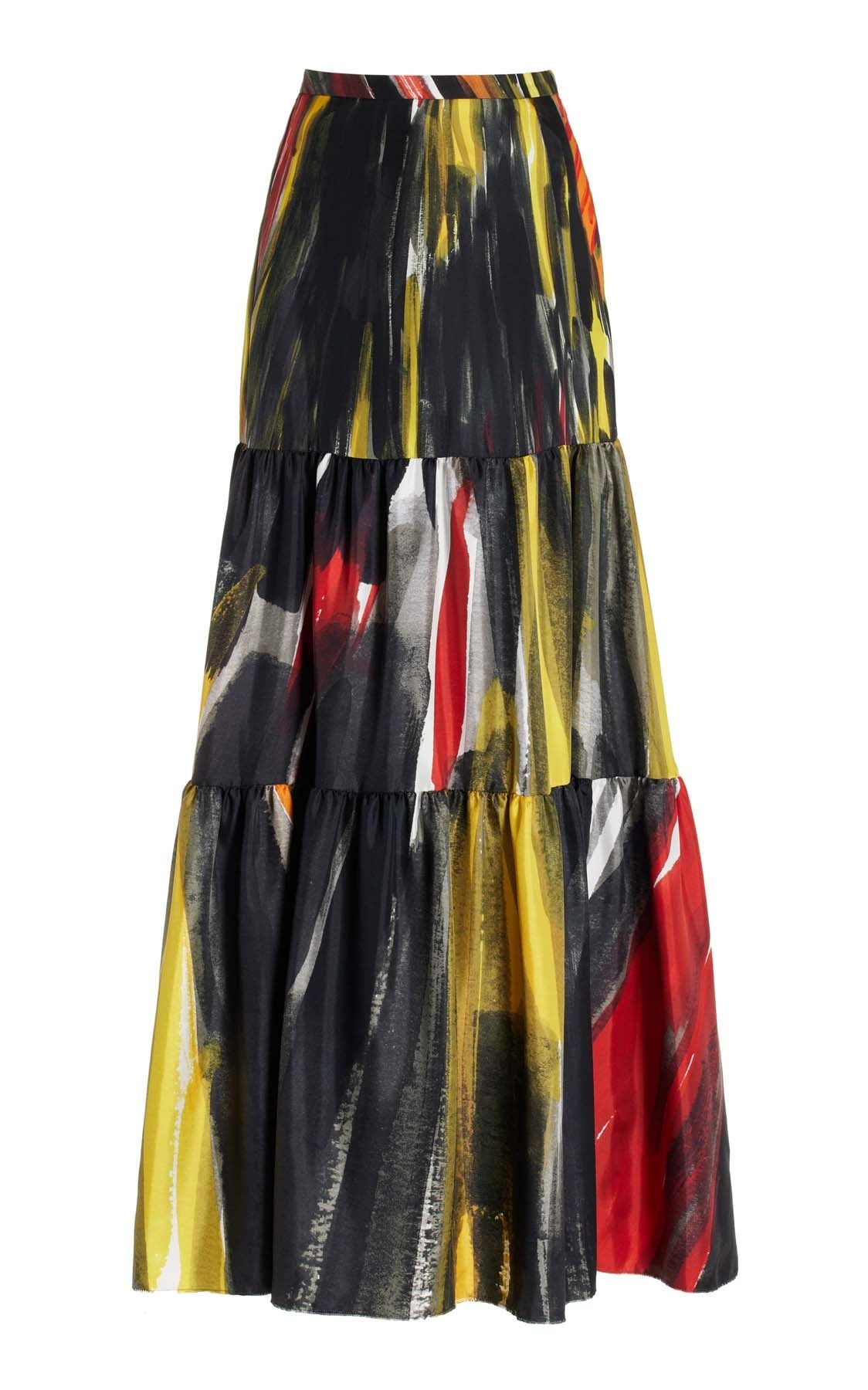 The Morse skirt boasts a multi-tier detail that skims the ankle with dramatic flare. The silk fabrication gives a soft, dramatic flow. Details: - 100% Silk - Made in Italy Size and Fit: Fits true to size. Model is 5'11" and wearing a size 38.