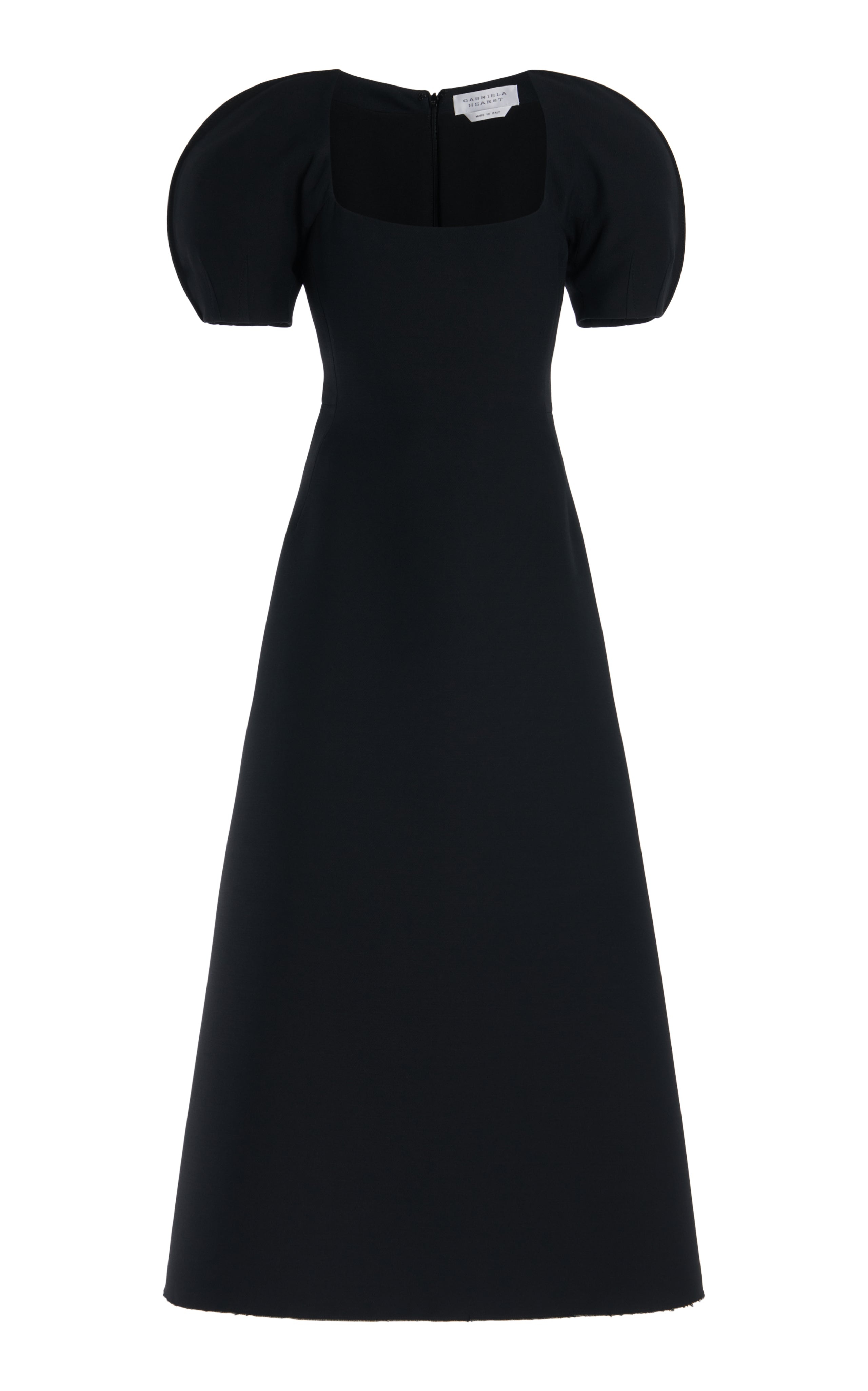 The Niahm dress creates a style with a flattering ease in structured silk wool cady. Complete with back zip detail this style hugs the hips and flares out dramatically towards the sweep. The fitted bodice is finished with a subtle center-front cut-out detail. Details: - 77% Wool, 23% Silk - Structured - Blouson sleeves - Above-the-elbow sleeves - Back-zip closure - Built-in bodice - Fit and Flare - Made in Italy