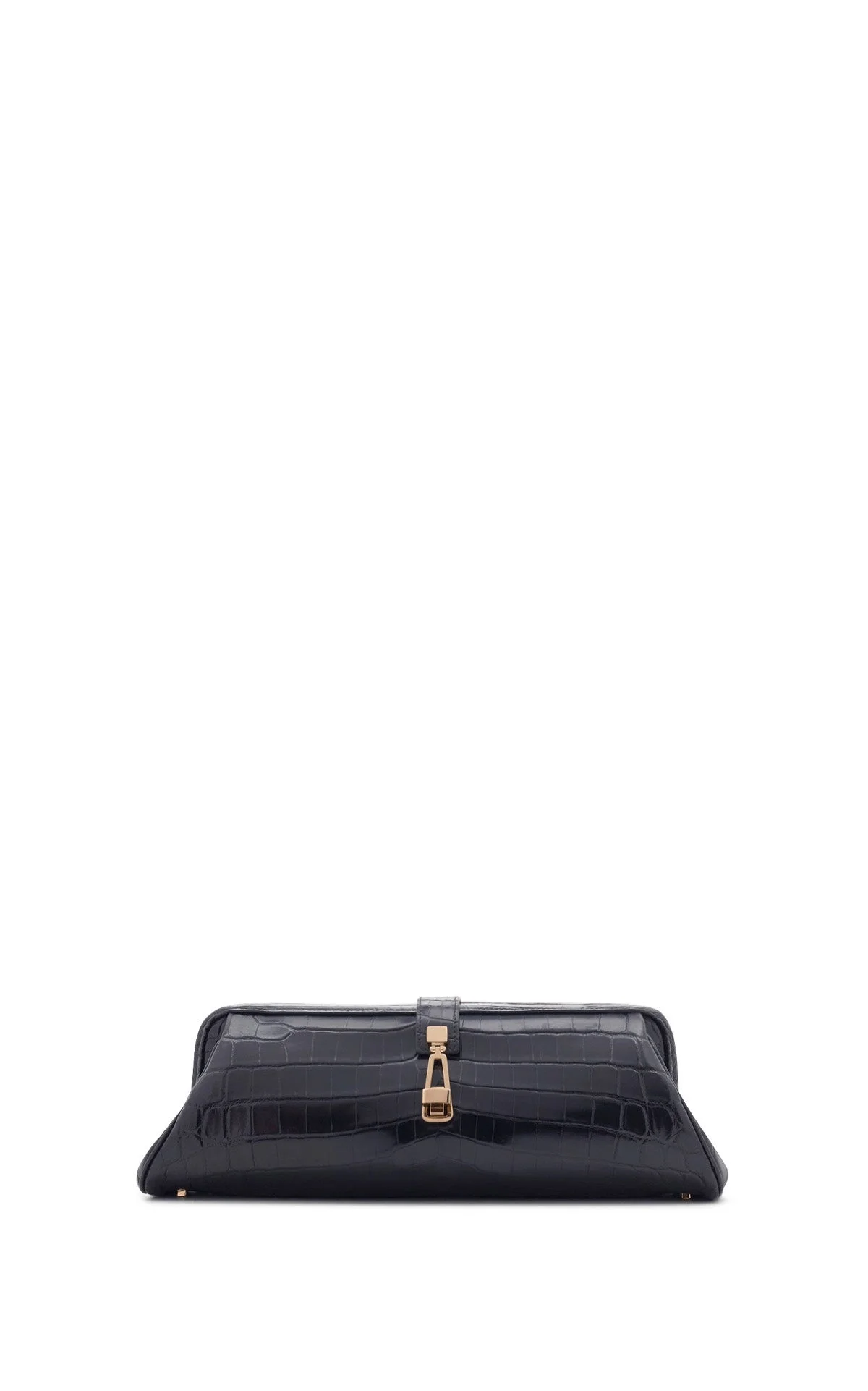 Crafted from Inversa crocodile skin, this structured baguette silhouette is refined by soft curves and a distinctive metal clasp. Designed for versatility, it can be carried by hand or worn over the shoulder. Details: - 100% Crocodile Leather - Height: 4.5'' - Length: 13'' - Width: 5'' - Structured top with turnlock closure - Removable shoulder strap with internal hooks - Can be worn as a clutch or shoulder bag - One compartment - One internal slip pocket - Fits an iPhone - Made in Italy In the interest of maintaining our brand values of sustainability, the Paola Clutch in Black Crocodile Leather is produced in limited quantities and is available by special order only. To order your bag, please complete the following form and click the “Inquire” button. You will be notified when your item becomes available. For any inquiries please contact us at customercare@gabrielahearst.com or call +1 212 966 2484 Monday through Friday, 9:00 AM to 6:00 PM EST
