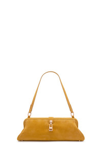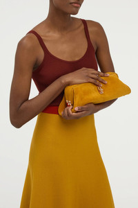 Crafted in suede, this structured baguette silhouette is refined by soft curves and a distinctive metal clasp. Designed for versatility, it can be carried by hand or worn over the shoulder. Details: - 100% Leather - Height: 4.5'' - Length: 13'' - Width: 5'' - Structured top with turnlock closure - Removable shoulder strap with internal hooks - Can be worn as a clutch or shoulder bag - One compartment - One internal slip pocket - Fits an iPhone - Made in Italy In the interest of maintaining our brand values of sustainability, the Paola Clutch in Golden Birch Suede is produced in limited quantities and is available by special order only. To order your bag, please complete the following form and click the “Inquire” button. You will be notified when your item becomes available. For any inquiries please contact us at customercare@gabrielahearst.com or call +1 212 966 2484 Monday through Friday, 9:00 AM to 6:00 PM EST