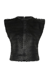 In the work of archaeologist Marija Gimbutas, the snake was revered in ancient European homes as a sacred emblem of good fortune, regeneration, prosperity, and fertility. The Pardee Jacket is nappa leather engineered to look like snake scales Details: - 100% Calf Leather - Sleeveless silhouette - Back zip close - Crew neckline - Made in Italy