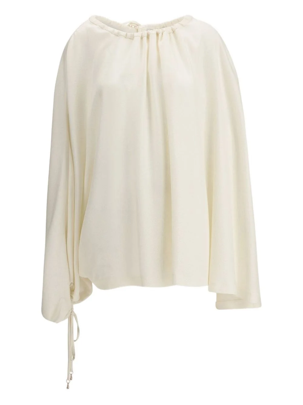 Wilmer drawstring-detail draped blouse Highlights - Cream - Gathered neckline - Long sleeves - Drawstring tie closure - Flowing design Made in Italy Composition Wool 75%, Silk 25% Washing instructions Read Manufacturer Guidelines