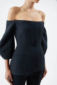 The off-the-shoulder Sawyer Jacket boasts a full sculpted sleeve constructed with darts, constrasting dramatically against the fitted bodice and hips. A single, self-button fastening completes this style. Crafted in luxurious wool silk cady. Details: - 77% Wool, 23% Silk - Made in the Italy Size and Fit: Fits true to size. Model is 5'11" and wearing a size 38.