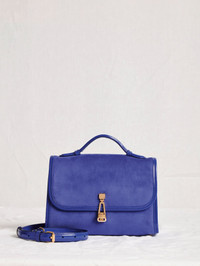 The Small Leonora flap bag is a satchel style with utilitarian leather binding, top-handle, removable and tuckable cross-body strap functionality in leather. All Leonora bags features an outside open pocket, credit card slots, interior pocket and back pocket slip. Details: - 100% Goat suede exterior - 100% Nappa leather interior - Turnlock closure - Front interior pocket - Two credit card slots - Outside exterior pocket - Detachable 23.5 crossbody strap - Non-detachable top handle strap - Length: 2.5" | 63.5 mm - Height: 6" | 152 mm - Width: 9" | 229 mm - Fits any iPhone size - Made in Italy