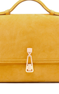 The Small Leonora flap bag is a satchel style with utilitarian leather binding, top-handle, removable and tuckable cross-body strap functionality in leather. All Leonora bags features an outside open pocket, credit card slots, interior pocket and back pocket slip. Details: - 100% Calf suede exterior - 100% Nappa leather interior - Turnlock closure - Front interior pocket - Two credit card slots - Outside exterior pocket - Detachable 23.5 crossbody strap - Non-detachable top handle strap - Length: 2.5" | 63.5 mm - Height: 6" | 152 mm - Width: 9" | 229 mm - Fits any iPhone size - Made in Italy