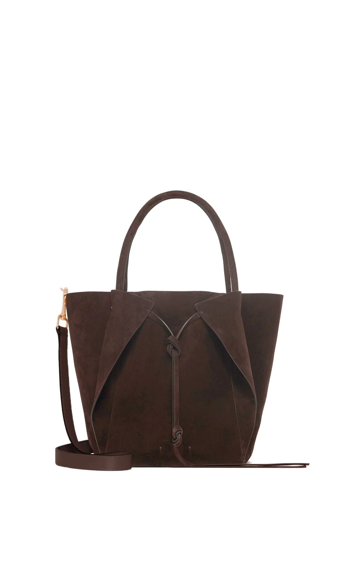 Named after archaeologist Marija Gimbutas, the Marija Tote is a carryall inspired by her work uncovering goddess-centered cultures. Made from lamb leather and with suede panels that fold in like wings, the shape suggests strength, protection, and quiet power. The central knotted tie nods to ancient spiral and snake motifs often found in her research—symbols of life, connection, and renewal. Details: - 100% Lamb Leather Exterior - 100% Calf Suede Lining - Includes removable pouch - Tie-Detail - Made in Italy - Length: 18" | 457.2 mm - Height: 12.5" | 317.5 mm - Width: 7.5" | 190.5 mm