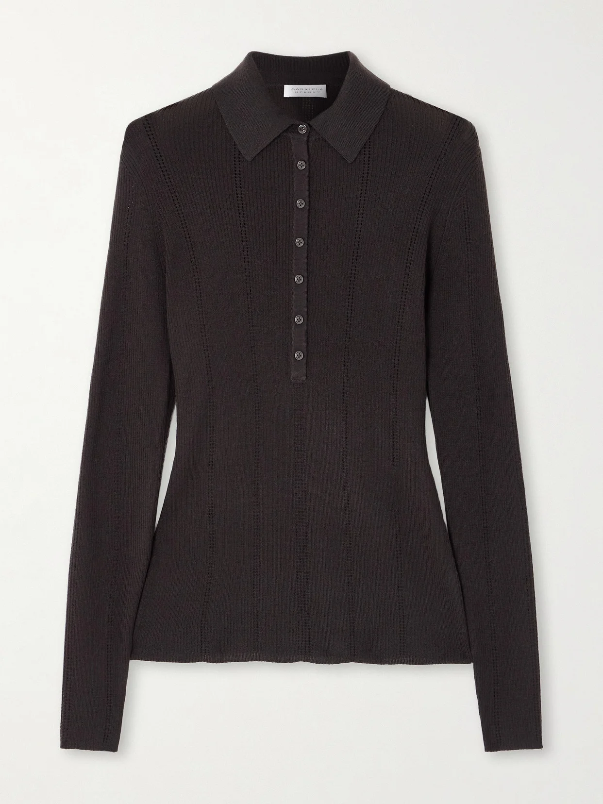 Understated elegance comes so effortlessly to Gabriela Hearst. This 'Sophia' polo shirt is made from wool with pointelle-knit stripes and a preppy collar. The rich dark-brown shade will go with just about any pants or skirt.