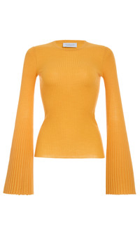 The Soraya Sweater is knit in a wide rib that expands from the elbow to sleeve cuff to give a dramatic flair. Knit in merino for breathability and stretch, it's slim fitting in the body and designed to be worn with the Aurora Skirt. Merino wool is fine and flexible, offering a lightweight, soft touch that moves with your body. It provides warmth while wicking away moisture, keeping you dry and comfortable. Naturally antimicrobial, it resists odors and requires minimal washing, ensuring enduring luxury. Details: - 100% Merino Wool - Ribbed - Slim-fit - Antimicrobial - Flared sleeves - Made from Italian yarns Size and Fit: Fits true to size.