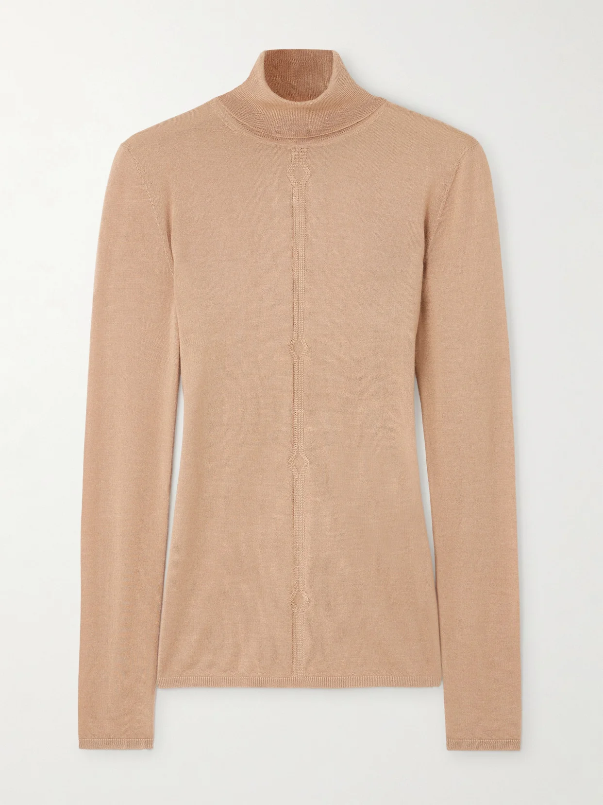 Gabriela Hearst's 'Steinem' sweater is knitted from cashmere with a touch of silk, giving it an even softer, smoother handle. It has a turtleneck collar and a ladder stitch through the front, which has a streamlining effect.