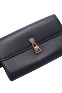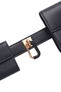 Crafted in smooth navy leather, this belt bag features two detachable compartments for everyday essentials. The larger pouch closes with a gold-tone clasp, while the smaller pocket has a snap closure. Finished with an adjustable strap, it can be worn at the waist or crossbody. Details: - 100% Calf Leather - 50% Calf Lining 50% Calf leather - 100% Metal brass hardware - Signature turnclock closure - One caravan clasp - Removable second pouch - Tonal stitch - Notch closure