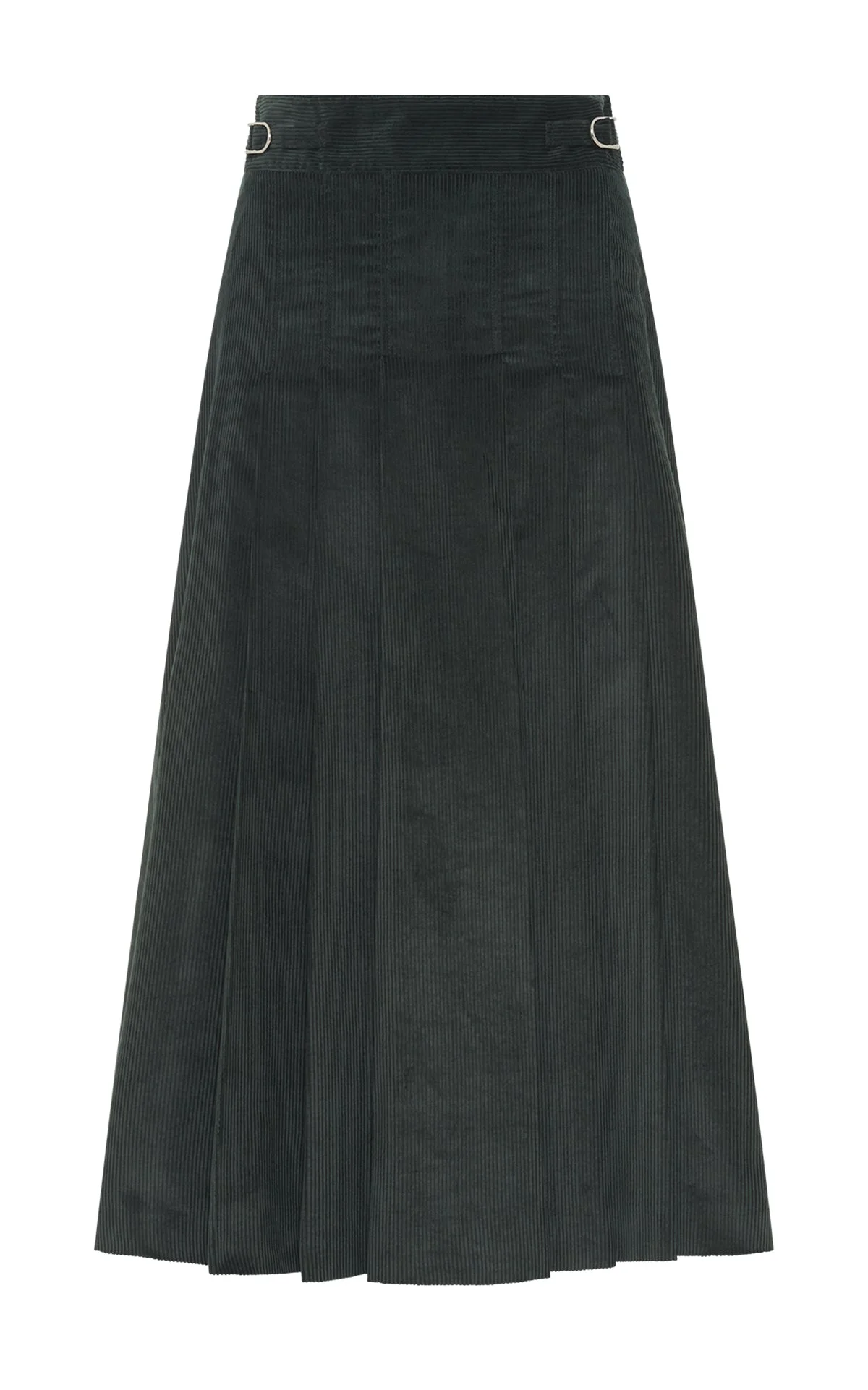 Wesley Pleated Midi Skirt in English Green Sea Island Cotton Corduroy