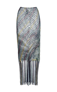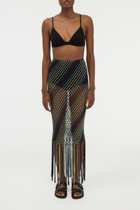 A striking design that maximizes movement, the Zana Skirt is handcrafted in 100% multicolor silk cord hand knotted macrame . Fringe detailing at the hem accentuates the skirts construction. Made to be worn with the Macaria top. Details: - 100% Silk - Maxi Length - Made in Uruguay