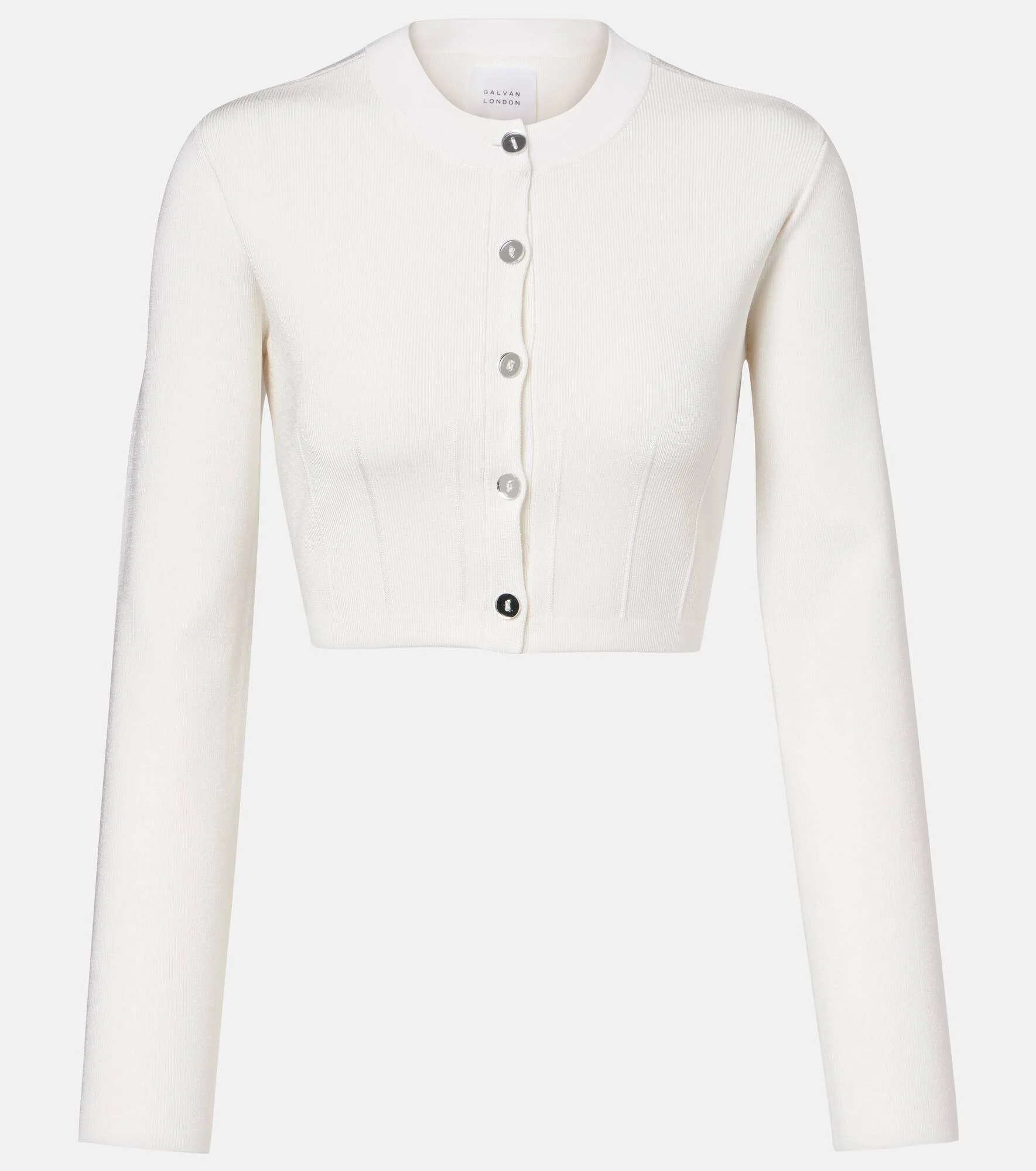Best-known for its modern take on eveningwear, women-run Galvan covers all the bases for a polished wardrobe. The Atalanta cardigan is cut to a cropped silhouette and features silver-toned buttons for a refined finish. Product Details - Material: 100% viscose - Care instructions: dry clean - Made in China - Designer color name: White - Item color: white - Closure: buttoned front - Collar: crewneck - Item number: P01048671 Size & Fit - True to size - Straight fit - Stretchy fabric - Cropped - The model seen in the picture is 178cm-5'10" and wearing a size XS