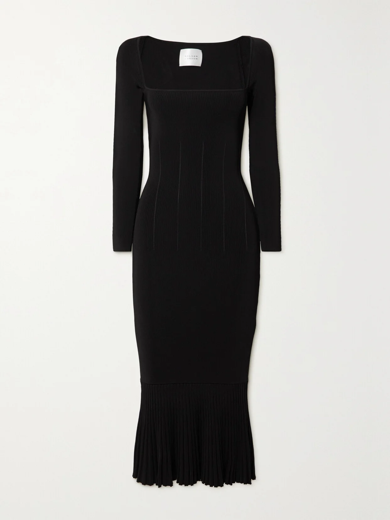 "Clean; cool, and pared down;" is how London-based brand Galvan defines its approach to eveningwear. From the Spring '21 collection, this 'Atalanta' dress is a cool version of the classic LBD. It's cut for a close fit from ribbed-knit before kicking out at the hem. The square neckline will frame your necklace so elegantly.