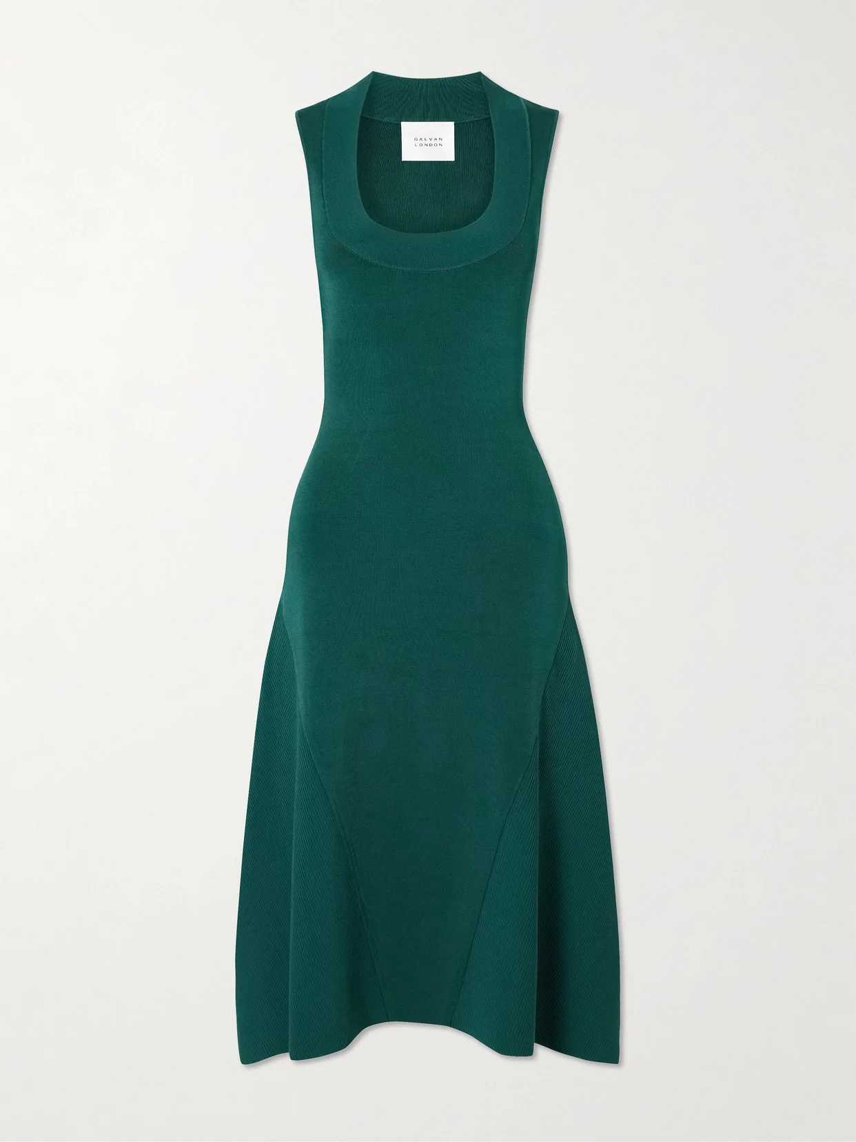 Galvan's ‘Claudia' midi dress has an elegant rounded neckline inspired by ballet bodysuits. It's knitted for a close fit with plenty of stretch and has ribbed panels at the sides that are softly pleated for subtle movement. Wear yours with drop earrings and sandals.