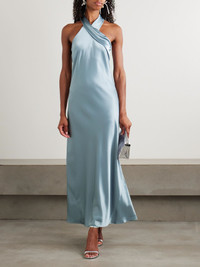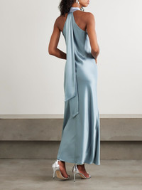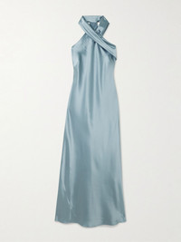Spotted on everyone from Heidi Klum to Karlie Kloss, Galvan's 'Pandora' dress has undoubtedly gained cult status. Cut on the bias from exceptionally soft satin made using certified cellulose, it has a twisted neckline and long ties at the back. Lower-Impact Materials. This product is made using at least 50% lower-impact materials or ingredients. Find out more about our NET SUSTAIN criteria here. Size & Fit - Fits true to size, take your normal size - Designed for a slim fit - Mid-weight, non-stretchy fabric - Model is 180cm/ 5'11" and is wearing a FR 36 Model measurements: - Bust: 81cm/ 32" - Waist: 62cm/ 24.5" - Hip: 89cm/ 35" Details & Care - Light-blue satin - Concealed hook fastening at neck - 80% triacetate, 20% polyester - Dry clean