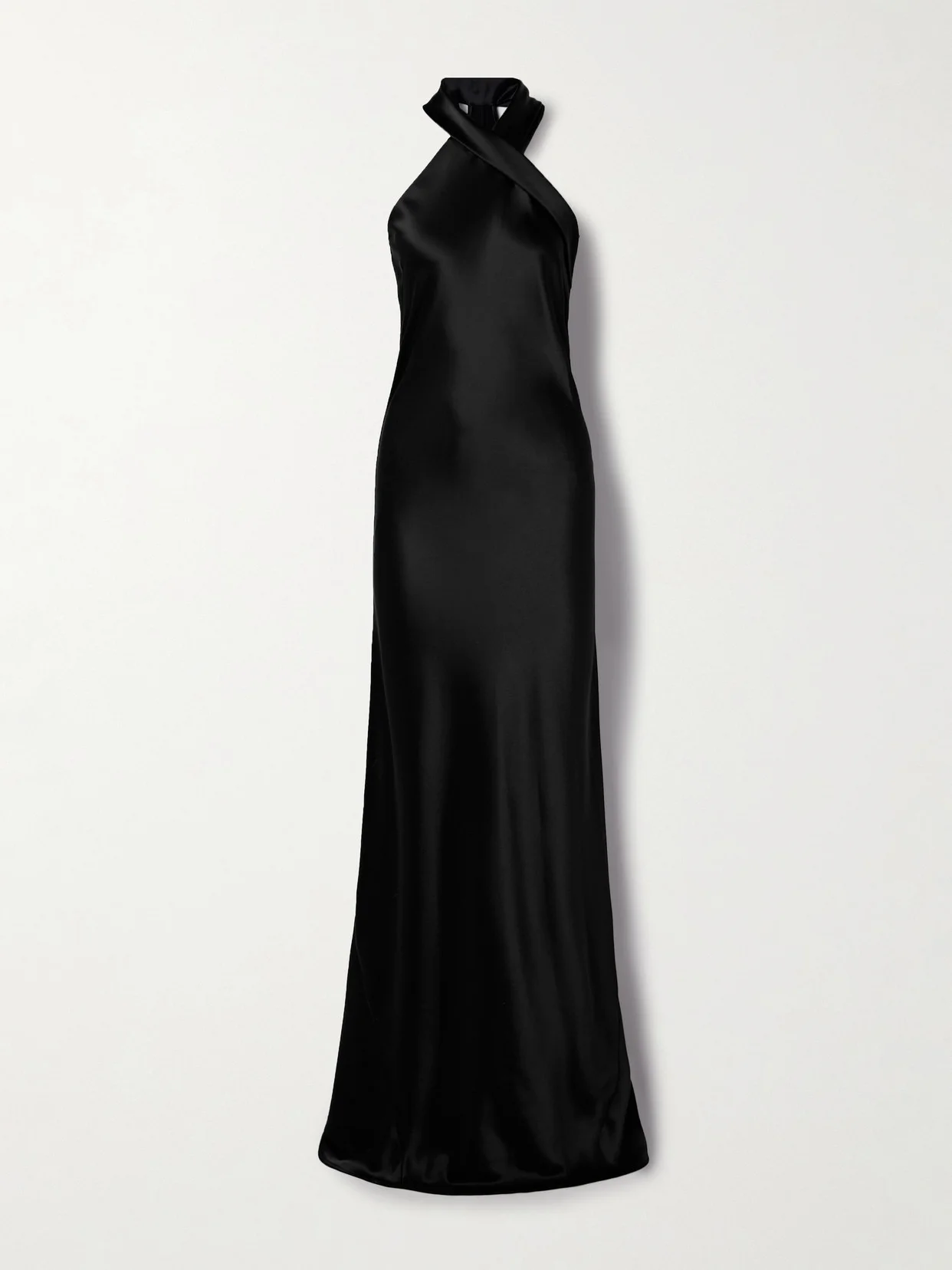 Galvan's 'Pandora' gown embodies timeless simplicity and elegance. It's made from black satin that has a lustrous sheen and is cut along the bias to lightly skim the figure. The twisted halter neckline is a masterclass in drapery.