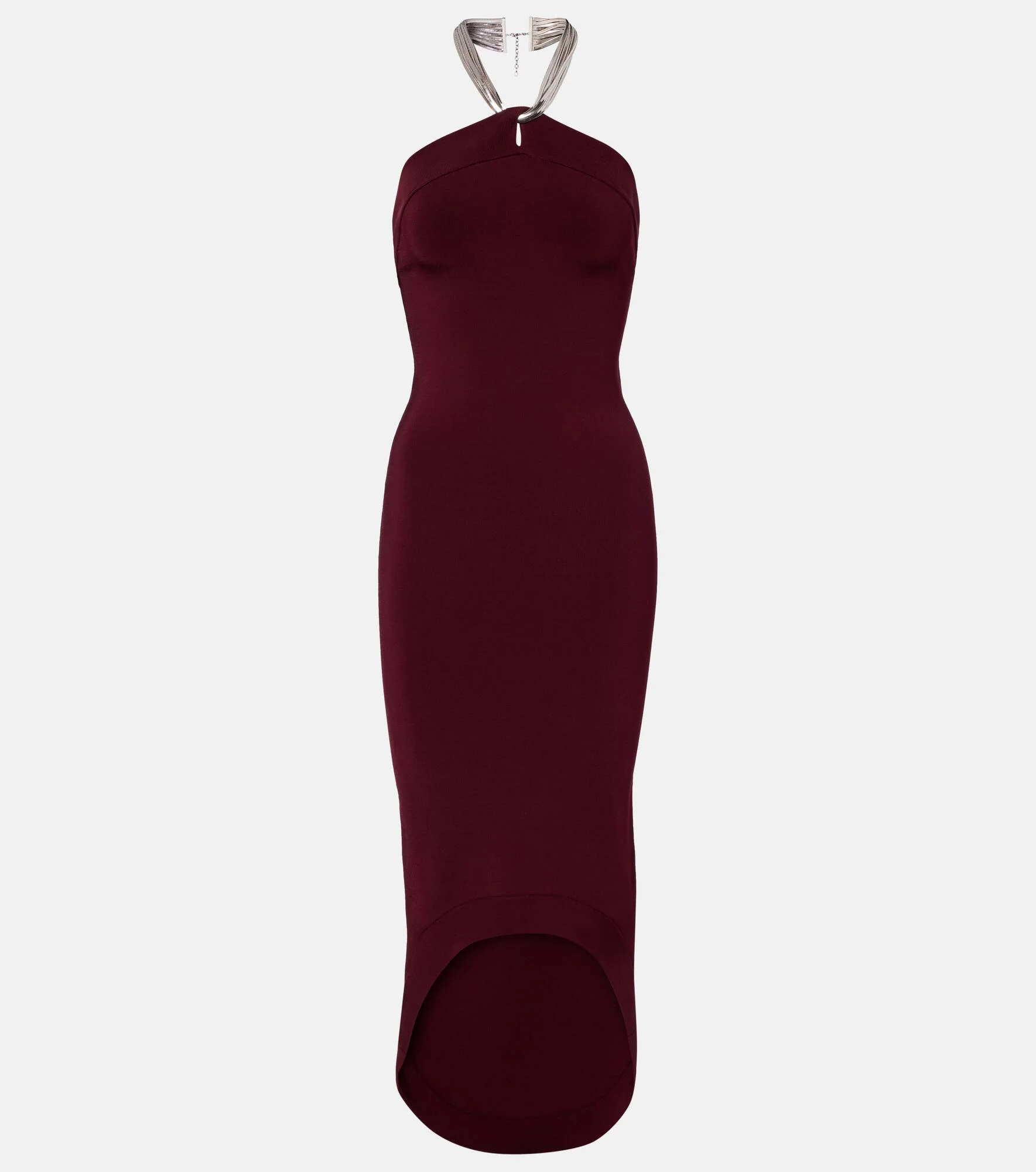 Best-known for its modern take on eveningwear, women-run Galvan covers all the bases for a polished wardrobe. This midi dress is tailored to a sculptural silhouette and finished with a silver-toned halterneck. Product Details - Material: 81% rayon, 17% nylon, 2% elastane - Care instructions: dry clean - Made in China - Designer color name: Mahogany - Item color: burgundy, silver - Item number: P01069776 Size & Fit - True to size - Low back - Fitted - Stretchy fabric - The model seen in the picture is 178cm-5'10" and wearing a size XS