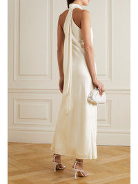 EXCLUSIVE AT NET-A-PORTER. Galvan updates its 'Pandora' gown in a pearlescent ivory hue that's perfect for rehearsal dinners, the wedding ceremony itself or the reception afterwards. Cut a little shorter, so it's easier to work the room (and show off a statement pair of heels), this dress is made from satin that drapes so elegantly over the body. Complement the halterneck with an updo or chignon.
