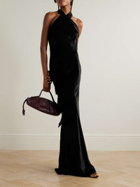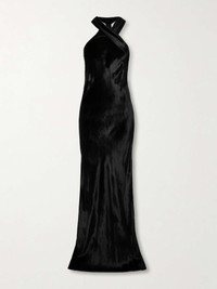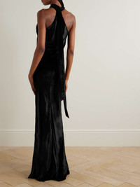 Galvan's 'Pandora' gown embodies timeless simplicity and elegance. It's made from black velvet that has a lustrous shine and is cut along the bias to lightly skim the figure. The twisted halter neckline is a masterclass in drapery. Size & Fit - Fits true to size, take your normal size - Designed for a slightly loose fit - Particularly long in length - Lightweight, fluid, non-stretchy fabric - Model is 177cm/ 5'10" and is wearing a FR 36 Model measurements: - Bust: 80cm/ 31.5" - Waist: 60cm/ 23.5" - Hip: 89cm/ 35" Details & Care - Black velvet - Concealed hook fastenings at neck - 85% viscose, 15% silk - Dry clean