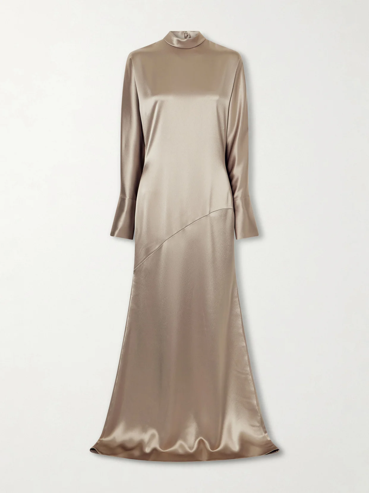 Sculptural and elegant, the 'Phoenix' gown by Galvan London is crafted from lustrous satin that falls fluidly along the body. The sweeping silhouette is defined by clean lines and precise draping. Founded by women and designed for women, the label brings a cosmopolitan sensibility to eveningwear.