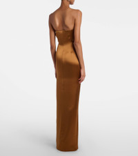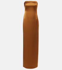 Best-known for its modern take on eveningwear, women-run Galvan covers all the bases for a polished wardrobe. Crafted from satin, this bustier gown features a strapless column silhouette, finished with a discreet zip closure. Product Details - Material: 80% triacetate, 20% polyester - Care instructions: dry clean - Made in Poland - Designer color name: Toffee - Item color: brown - Lining: 82% polyamide, 18% elastane - Closure: invisible zipper - Built-in bustier - Boning - Long vent - Item number: P01069767 Size & Fit - True to size - Strapless - Internal boned corset for support - Fitted - Non-stretchy fabric - slit length 81cm-32" - The model seen in the picture is 178cm-5'10" and wearing a size FR 36