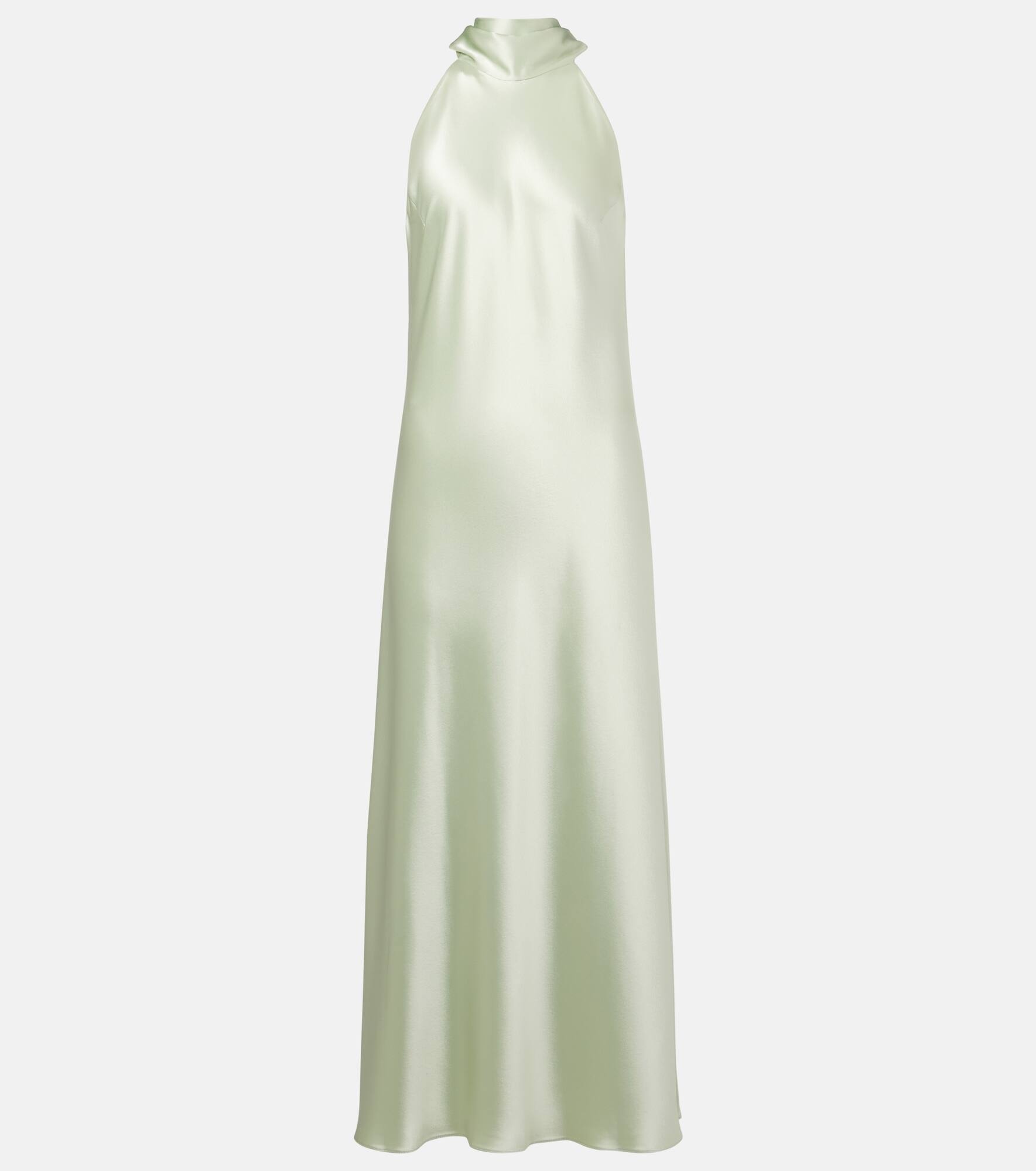 Galvan is a household name for pared-down and ever-elegant eveningwear. The Sienna satin maxi dress features a striking scarf detail, a streamlined silhouette, and fluid draping that combines refined simplicity with modern sophistication. Product Details - Material: 80% triacetate, 20% polyester - Care instructions: dry clean - Made in the UK - Designer color name: Melon - Item color: green - Closure: self-ties - Item number: P01023047 Size & Fit - True to size - Cinched waist - Non-stretchy fabric - The model seen in the picture is 178cm-5'10" and wearing a size FR 36