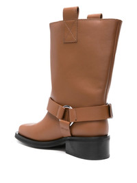 50mm biker boots GANNI’s interpretation of the popular biker boot includes an exaggerated shaft, as seen on this brown faux-leather pair. The buckled straps and O-ring hardware remain true to their roots. Highlights - Cognac brown - Faux leather - Low stacked heel - Buckle-strap detailing - Ring hardware detailing - Silver-tone stud detailing - Double pull-tab at the opening - Square toe - Calf-length - Branded footbed Imported Composition Other fibres 100% SIZE & FIT Measurement CIRCUMFERENCE 16.53 in(42 cm) HEEL 1.96 in(5 cm) HEIGHT 9.44 in(24 cm) Sole height 0.59 in(1.5 cm)