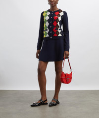 DETAILS Wool-cashmere cardigan Multicoloured argyle design Fitted Long sleeves Round neckline Button closure GANNI butterfly log buttons GANNI logo SIZE & FIT Model is 176cm/5'9.5"; Chest: 78cm; Waist: 62cm; Hip: 91cm and wears a size S COMPOSITION & CARE 70% Wool; 30% Cashmere Hand wash