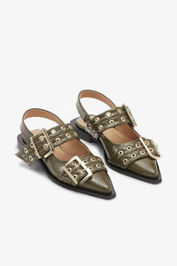 These Olive Green Feminine Buckle Ballerinas feature slingback straps and a pointed toe. The shoes have two gold-tone buckles with matching eyelets and a black squared block heel. DETAILS - 56% polyurethane, 44% recycled cotton. Learn more about our materials - Slingback straps - Pointed toe - Two gold-tone buckles with eyelets - Black squared block heels Made in: Portugal Product ID: S2872 SIZE & FIT - Fits true to size, take your normal size