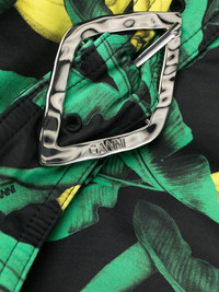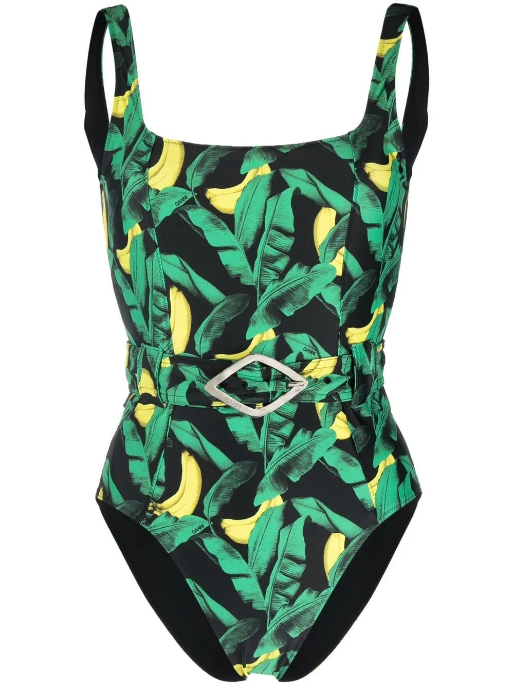 banana tree-print belted swimsuit GANNI presents its playful take on swimwear with this banana tree-print swimsuit. A matching belt cinches at the waist. Highlights - Green/yellow/black - Stretch-recycled nylon - Banana tree print - Square neck - Thin shoulder straps - Scoop back - Belted waist - Be mindful to try on swimwear over your own garments. Imported Composition Outer: Recycled Polyamide 78%, Elastane 22% Lining: Recycled Polyamide 83%, Spandex/Elastane 17% Washing instructions Machine Wash