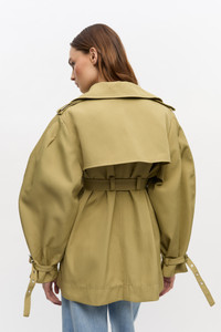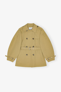 This trench coat features a double-breasted design with button details, a belted waist, epaulettes on the shoulders and buckle details at the cuff. DETAILS - 100% recycled polyester. Learn more about our materials - Classic collar - Double-breasted with button details - Belted waist for adjustable fit - Epaulettes on shoulders - Embroidered GANNI logo - Buckle detail at the cuffs Made in: China Product ID: W0396 SIZE & FIT - Regular fit - Bernie is 5’10” and wears a size US 4