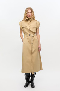This dress features a large collar, deep v-neckline with three tie bands at the front and button shoulder details. The dress has short adjustable sleeves, 4 pockets and a matching belt. DETAILS - 83% organic cotton, 17% linen. Learn more about our materials - Lining composition: Pocket lining: 100% Cotton - Large collar - Deep V-neck - Short adjustable sleeves - Three tie bands - Button shoulder details - Belted detail at the collar - 4 pockets - Matching belt Made in: Turkey Product ID: W0509 SIZE & FIT - Relaxed fit - For personalised guidance on sizing and fit, contact our Customer Service team - here - .