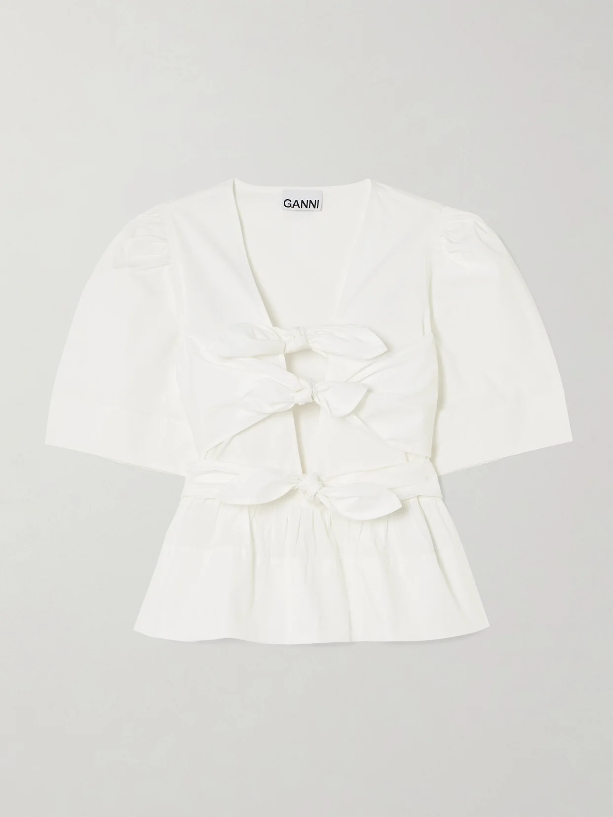 GANNI's blouse captures the Scandi brand's playful and romantic style. It's made from crisp cotton-blend poplin and has puffed sleeves and a peplum hem. A trio of bows temper the plunging V-neckline, creating skin-baring cutouts between them.
