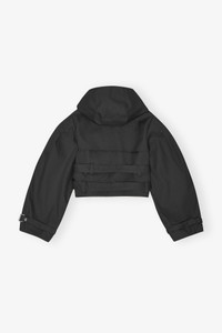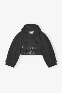 Revealed on the Spring/Summer 2025 runway The Black Bonded Cotton Short Trench Jacket is a timeless wardrobe staple that will see you through every season. Crafted from organic cotton, it features a double-breasted button closure, iconic puff sleeves in a curved design with an adjustable eyelet belt detail, a metallic GANNI logo, and two adjustable, removable belts at the waist. DETAILS - 100% organic cotton. Learn more about our materials - Double-breasted button closure - Hood Made in: China Product ID: W1112 SIZE & FIT - Regular fit - For personalised guidance on sizing and fit, contact our Customer Service team - here - .