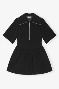The Black Bonded Crepe Mini Dress is defined by a bold heavy silver zipper and a playful flouncy skirt, making it perfect for both everyday wear and special occasions. Crafted from recycled polyester with a textured, crepe-like finish, this mini dress features a versatile high collar that can be worn up or folded down and is finished with black stitch detailing. DETAILS - 100% recycled polyester. Learn more about our materials - High collar - Heavy zip closure - Flared skirt Made in: China Product ID: W0257 SIZE & FIT - Cara is 5’9” and wears a size US 4