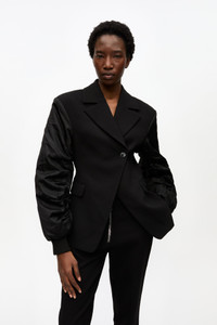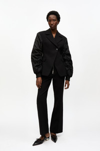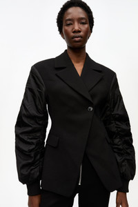 This Black Bonded Crepe Mix Jacket features a collar, double-breasted button closure, curved sleeves and ribbed edges. DETAILS - 100% recycled polyester. Learn more about our materials - Lining composition: 57% Acetate 43% Viscose - Collar - Curved sleeves - Double-breasted button closure - Ribbed edges Made in: China Product ID: W0244 SIZE & FIT - Zayna is 5’10” and wears a size US 4