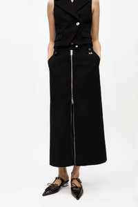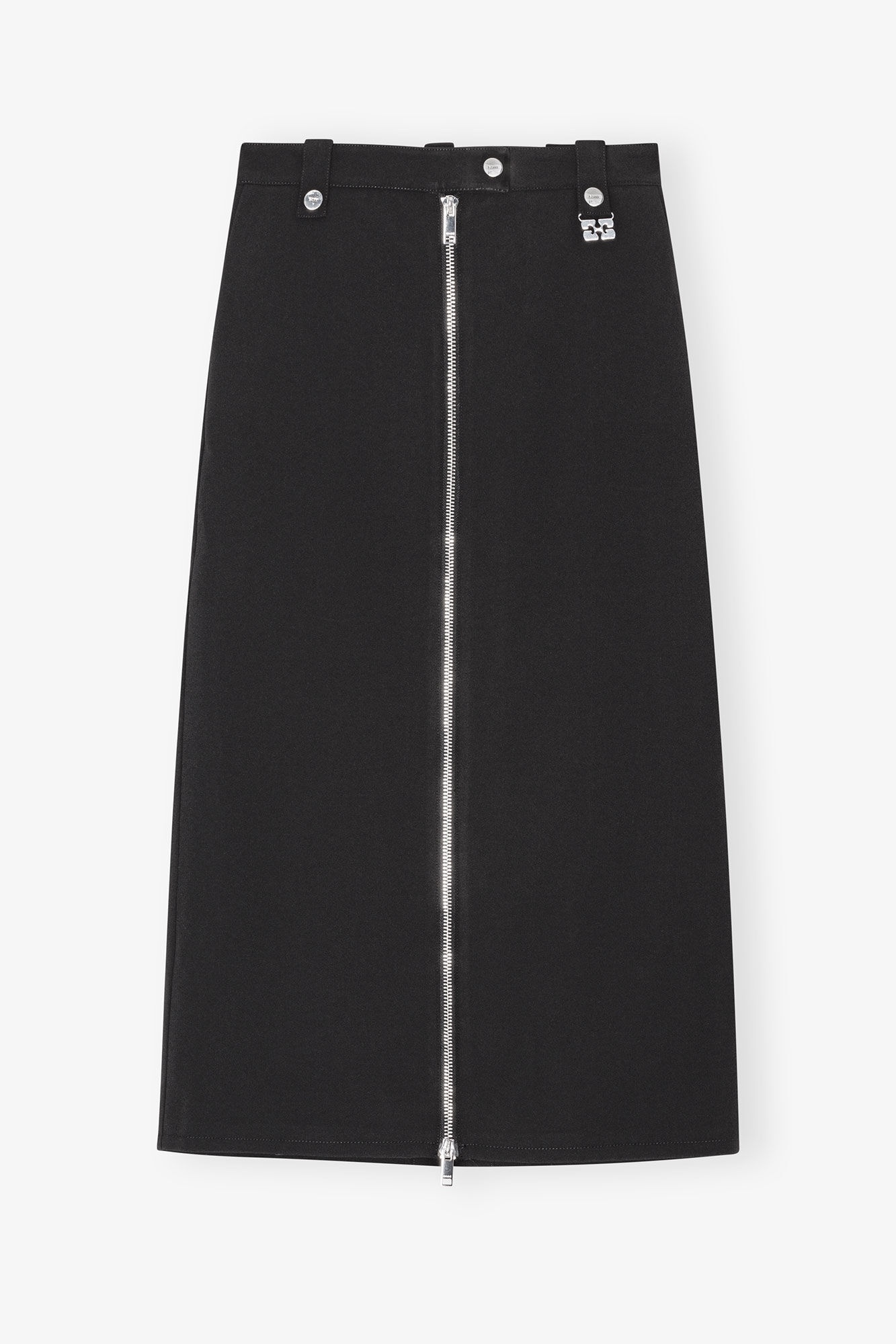 This Black Bonded Crepe Skirt features belt loops, a zip and button closure, side pockets, a back pocket and a silver GANNI Butterfly hardware logo. DETAILS - 100% recycled polyester. Learn more about our materials - Lining composition: 57% Acetate 43% Viscose - Heavy zip closure - Snap button closure with GANNI logos - Side pockets - Back pocket - Belt loops - GANNI Butterfly hardware logo Made in: China Product ID: W0240 SIZE & FIT - Denise is 5’9” and wears a size US 4
