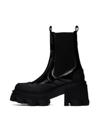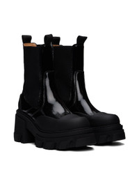 Mid-calf crinkled patent calfskin Chelsea boots in black. · Rubber cap toe · Webbing pull-loops at collar · Elasticized gusset at sides · Logo bonded at heel tab · Logo embossed at rubber block heel · Treaded rubber sole · Heel: H3" Supplier color: Black