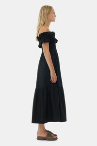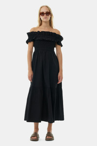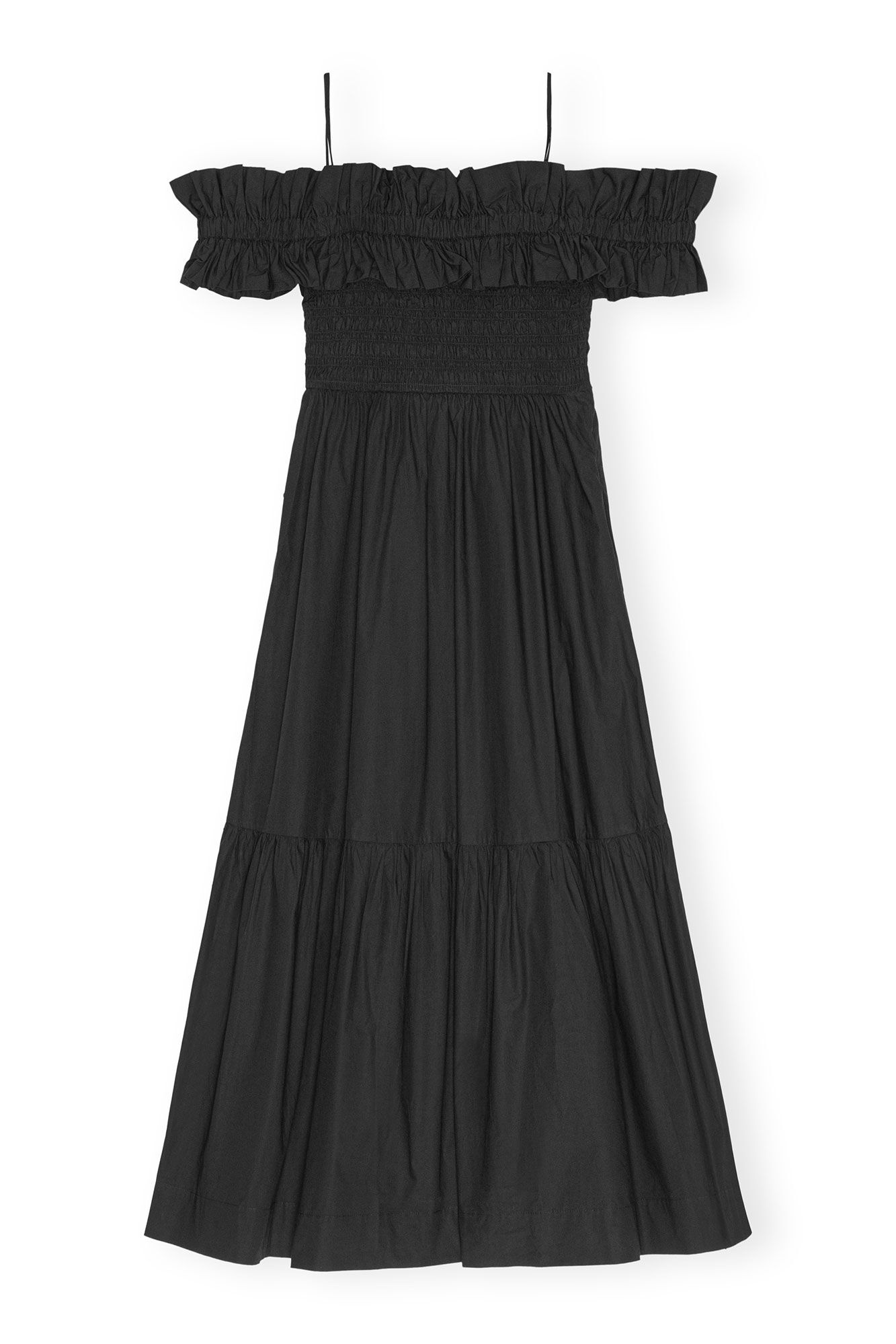 This Black Cotton Poplin Long Smock Dress is designed for a regular fit with a ruffled off-shoulder neckline, smock bodice and two straps. DETAILS - 100% organic cotton. Learn more about our materials - Slip-on style - Ruffled off-shoulder neckline - Smock bodice - Two straps Made in: India Product ID: F9168 SIZE & FIT - Designed for a regular fit with a slightly defined waist - Fits true to size, take your normal size - Lightweight, slightly stiff cotton poplin fabric - Daria is 5’9” and wears a size US 4