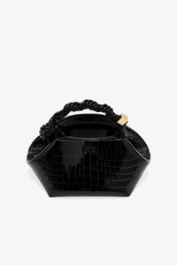 This Black Croco Patent Small GANNI Bou Bag features a tone-on-tone metallic GANNI Butterfly logo, a twisted handle with a braided knot, and a gold-tone metallic dice with a GANNI Butterfly logo engraved. The bag has an internal magnetic closure, a flat card pocket inside, and an adjustable and removable shoulder strap for crossbody wear. DETAILS - 52% recycled leather, 27% polyester, 21% polyurethane fibre. Learn more about our materials - Lining composition: 65% Recycled Cotton 35% Cotton - Adjustable and removable shoulder strap - Tone-on-tone GANNI Butterfly logo - GANNI embossed logo on the back of the bag - Braided top handle with a braided knot - Metallic dice with a GANNI and Butterfly logo engraved - Internal magnet closure - Two compartments - Flat card pocket inside Made in: China Product ID: A6083 SIZE & FIT - Strap length: 50 - Height: 14 - Width: 28 - Depth: 17