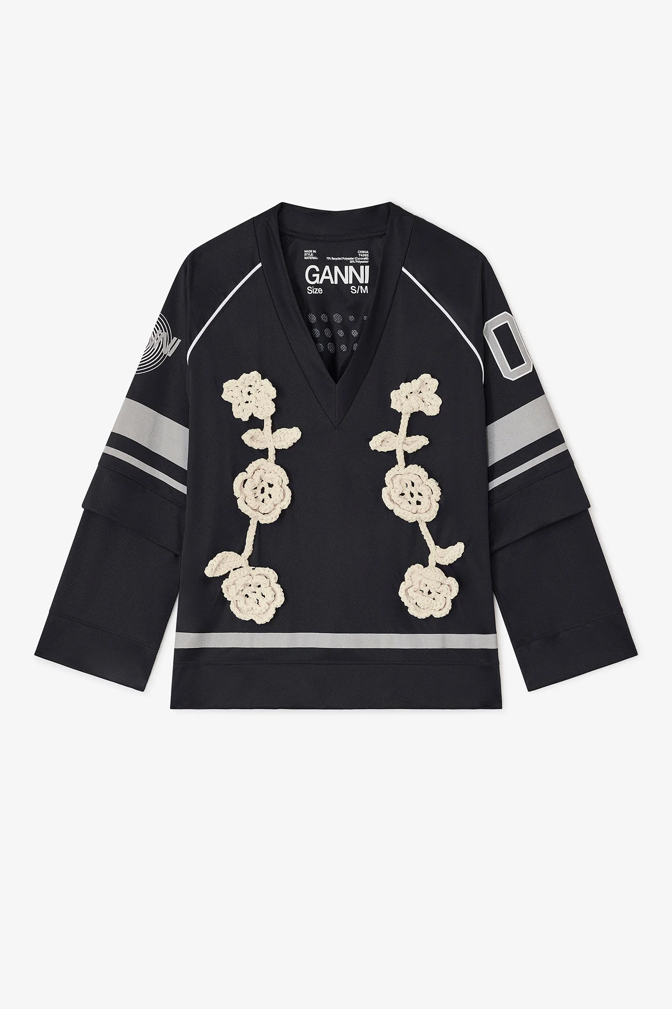 This top features a V-neckline, long sleeves and flower crochet detailing. DETAILS - 70% polyester, 30% recycled polyester (Cycora®) . Learn more about our materials - V-neckline - Long sleeves - Flower crochet detailing This style contains cycora®. cycora® is turning the textiles of the past into the clothing of the future. Made entirely from textile waste, using advanced molecular regeneration technology, textiles are broken down to the molecular level and transformed into cycora® yarns. cycora® is part of GANNI’s Fabrics of the Future, a programme set up in 2019 by GANNI to research, test and eventually scale innovative materials that challenge conventional material methods, paving the way for the future of fashion. Made in: China Product ID: T4392 SIZE & FIT - Oversized fit - Ayesha is 5’9” and wears a size S/M - For personalised guidance on sizing and fit, contact our Customer Service team - here - .