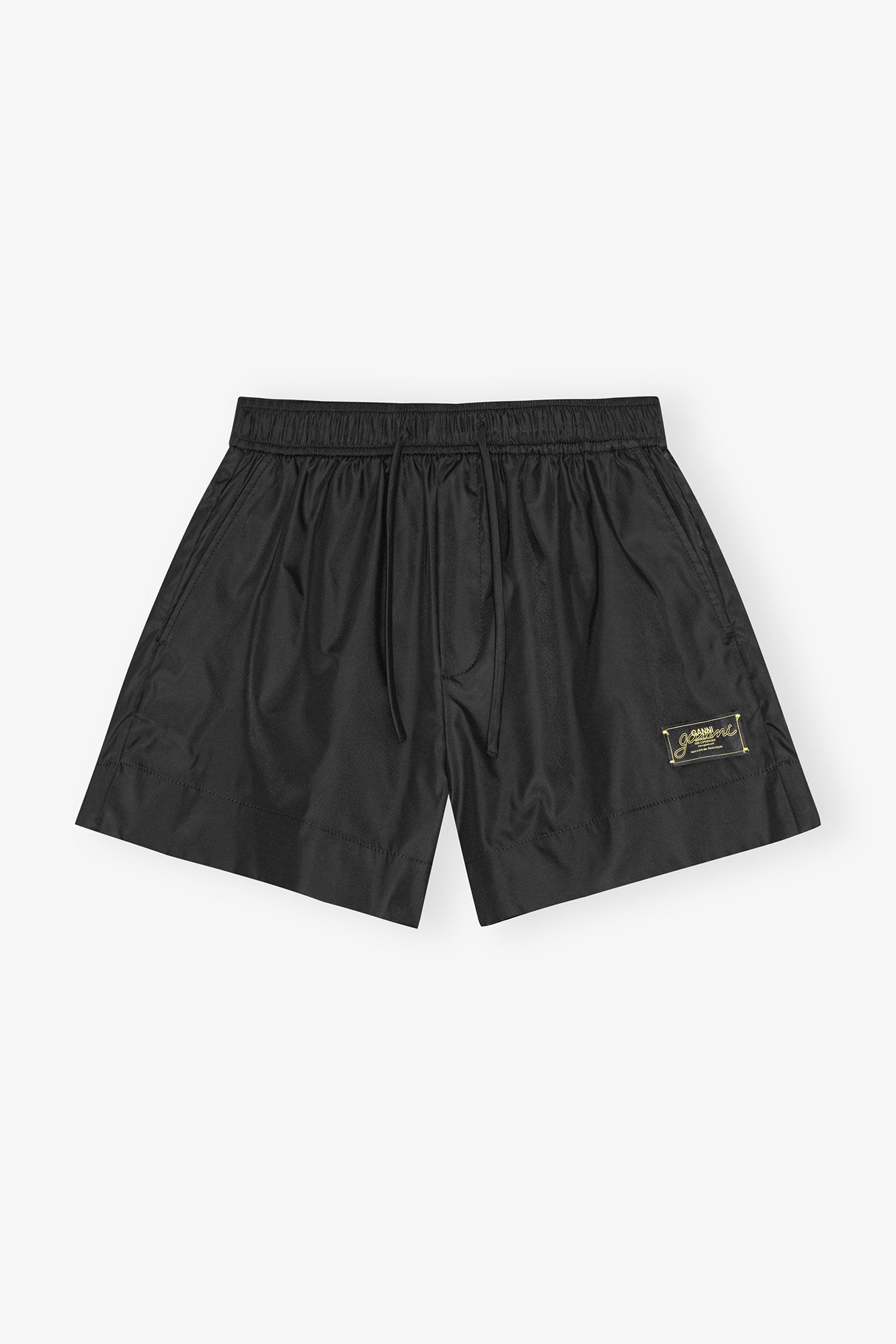 These Black Duchesse Nylon Shorts feature an elasticated waistband with adjustable drawstrings, functional side slit pockets, and a GANNI logo patch. DETAILS - 93% Recycled Polyamide 7% Polyurethane. Learn more about our materials - Side pockets - Adjustable drawstring waist - Sewn-on GANNI logo patch Made in: China Product ID: W0485 SIZE & FIT - Regular fit