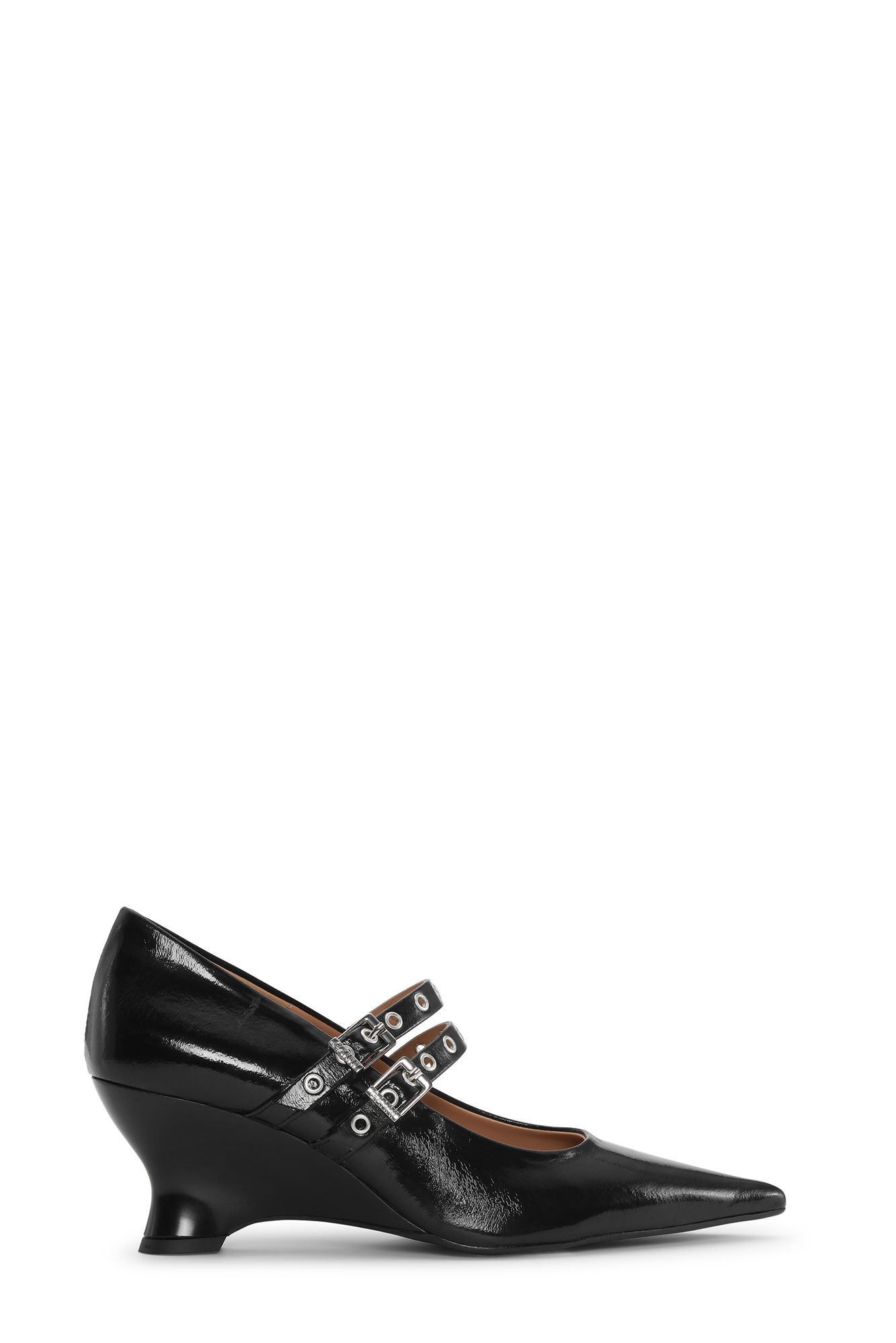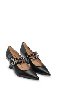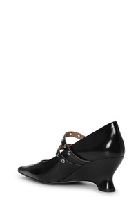 These Black Eyelets Low Wedge Pumps feature metallic eyelets, mary-jane straps, pointy toes and low wedge heels. DETAILS - 56% polyurethane (bio-based), 44% cotton - Heel height: 6 cm - Metallic eyelets - Mary-jane straps - Pointy toes - Low wedge heels Made in: Portugal Product ID: S2512 SIZE & FIT - Fits true to size, take your normal size