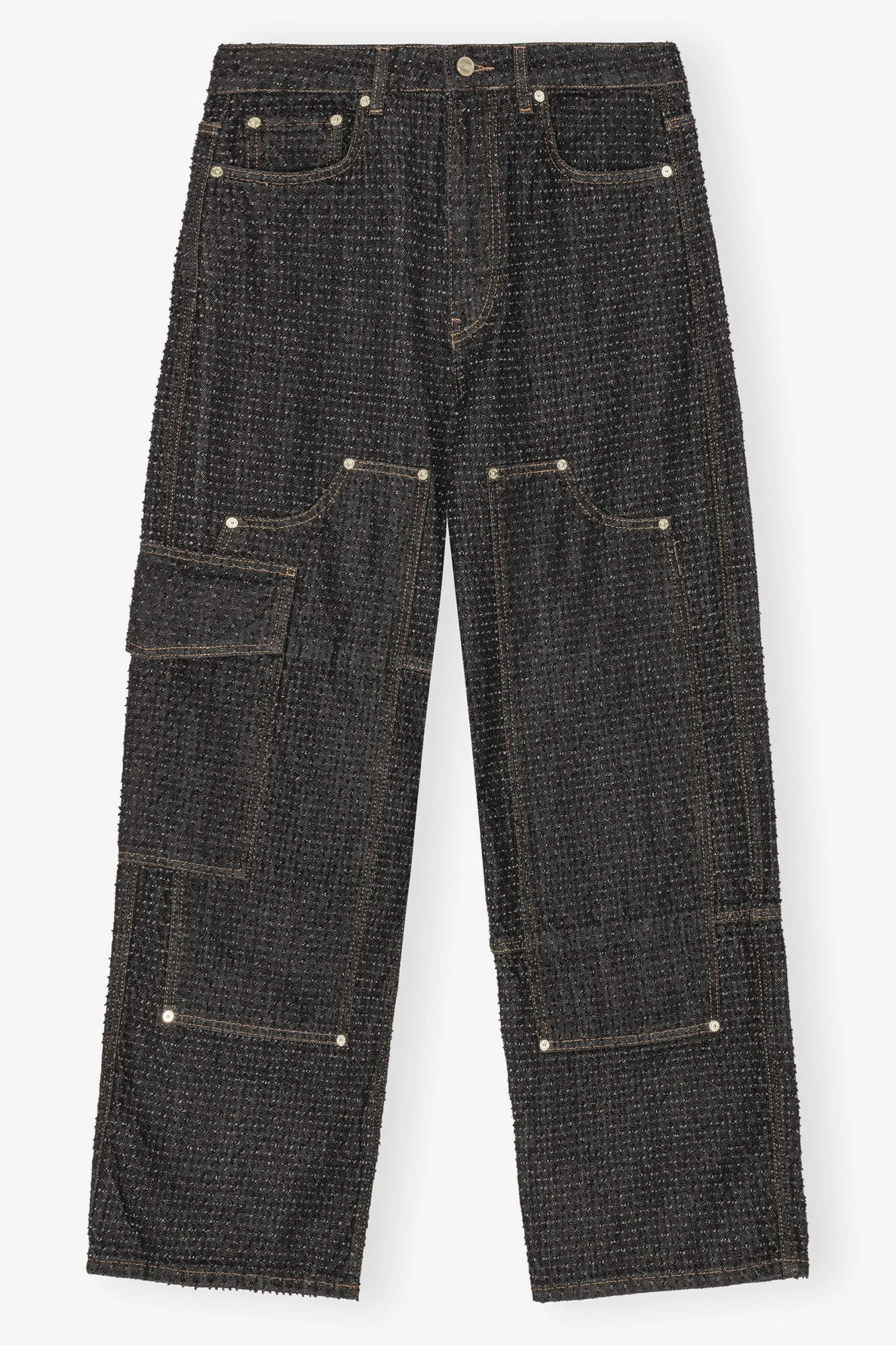 These Black Fluffy Denim Carpenter Jeans feature 5 pockets and side cargo pockets. The jeans have a zip-and-button closure, belt loops and a GANNI logo on the back pocket. DETAILS - 100% organic cotton. Learn more about our materials - Zip and button closure - 5 pockets - Side cargo pockets - Belt loops Made in: Turkey Product ID: J1617 SIZE & FIT - Relaxed fit - Noor is 5’11” and wears a size 27