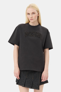 This Black Heavy Cotton Drop Shoulder T-shirt features a round neckline, short sleeves and a GANNI logo. DETAILS - 100% organic cotton. Learn more about our materials - Crew neck - Short sleeves with dropped shoulders - GANNI logo Made in: Portugal Product ID: T4095 SIZE & FIT - Relaxed fit - Lisandra is 5’10” and wears a size S