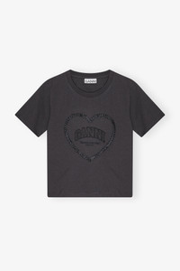 This Black Heavy Cotton Heart T-Shirt features a round neckline, short sleeves, an embroidered heart with a GANNI logo and the phrase 'Have a nice day! Please recycle.' DETAILS - 100% organic cotton. Learn more about our materials - Crew neck - Short sleeves - Embroidered heart with GANNI logo Made in: Portugal Product ID: T4178 SIZE & FIT - Elvina is 5’11” and wears a size S