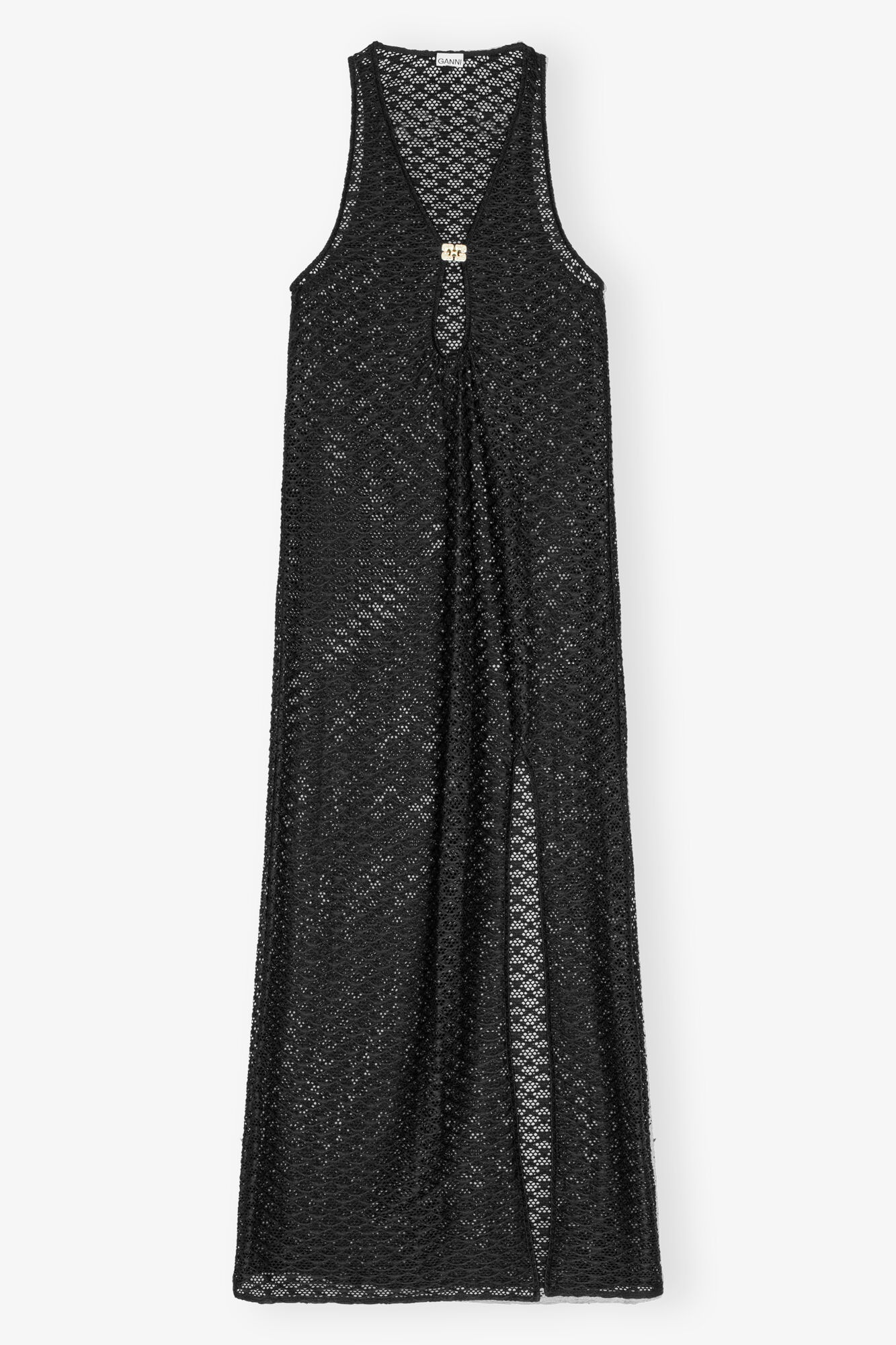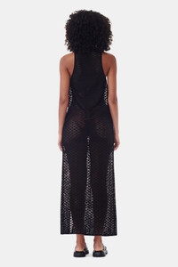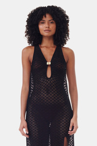 This Black Mesh Lace Long Dress features a v-neckline and a gold GANNI butterfly closure at the front. DETAILS - 90% recycled nylon, 10% elastane. Learn more about our materials - V-neckline - Slip-on style Made in: Turkey Product ID: T3911 SIZE & FIT - Slim fit - Graziela is 5’9” and wears a size US 4